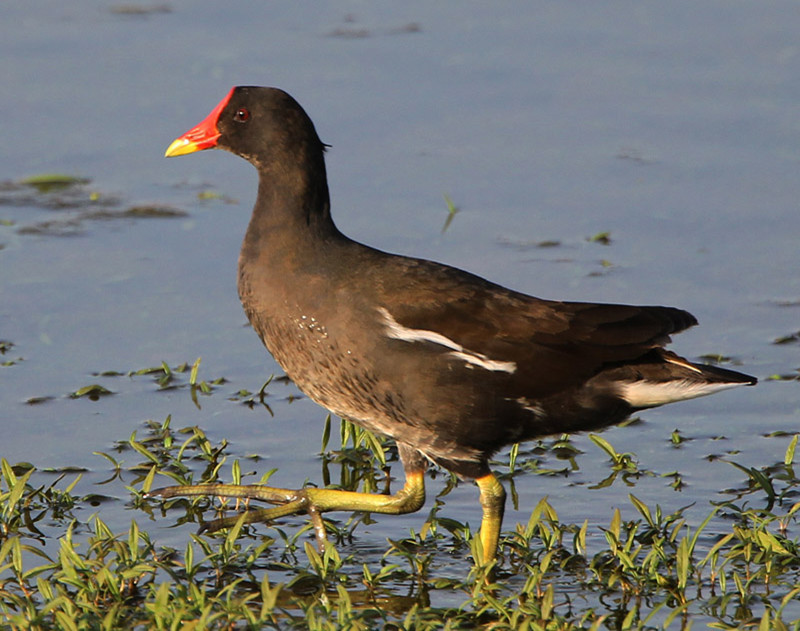 涉禽,體長24~35cm,體重141~400g。通體黑褐色,嘴黃色,嘴基與額甲紅色,兩脅具寬闊的白色縱紋,尾下覆羽兩側亦為白色,中間黑色;腳黃綠色,腳上部有一鮮紅環帶。棲息于富有蘆葦和水生挺水植物的沼澤、湖泊、水庫、葦塘及水田中,善游泳和潛水。主要吃水生植物以及水生昆蟲、蠕蟲、蜘蛛、蝸牛和昆蟲幼蟲等。營巢于水邊淺水處蘆葦叢或水草叢中。雛鳥早成性。洞庭湖為留鳥。數量較豐。少見。