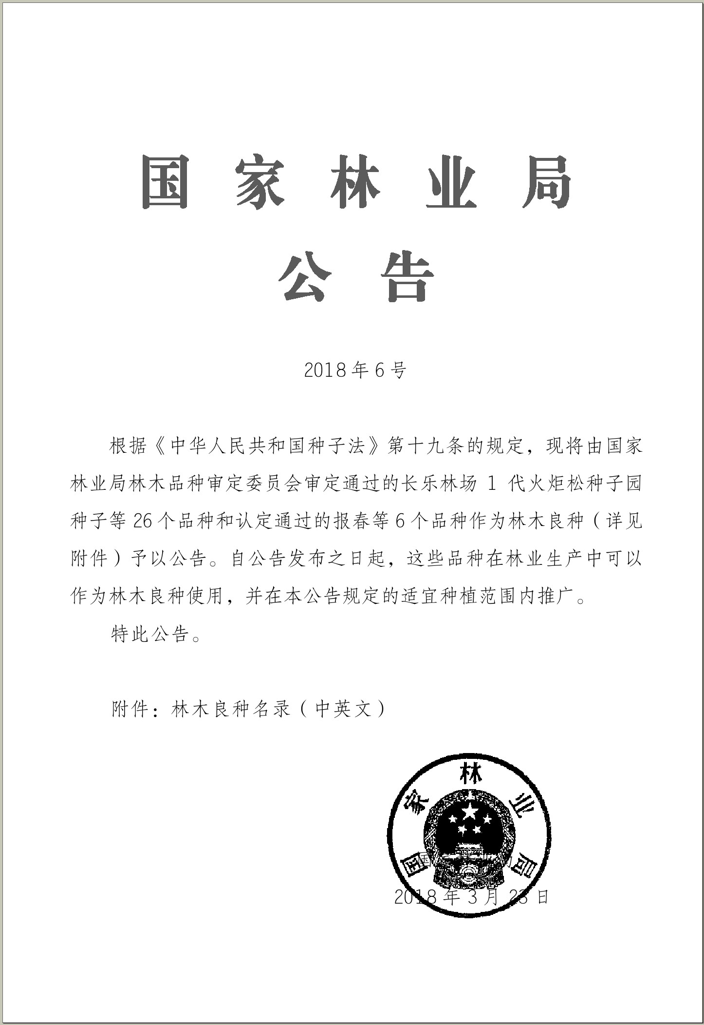國家林業局公告(2018年6號)